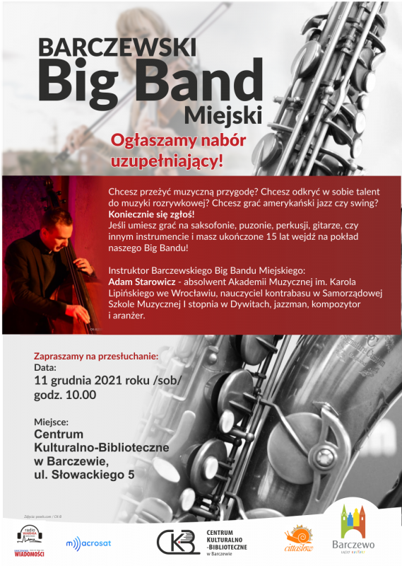 Zapraszamy na przesłuchanie instrumentalistów chcących dołączyć do Barczewskiego Big Bandu Miejskiego 11 grudnia 2021 roku /sobota/ godz. 10.00.