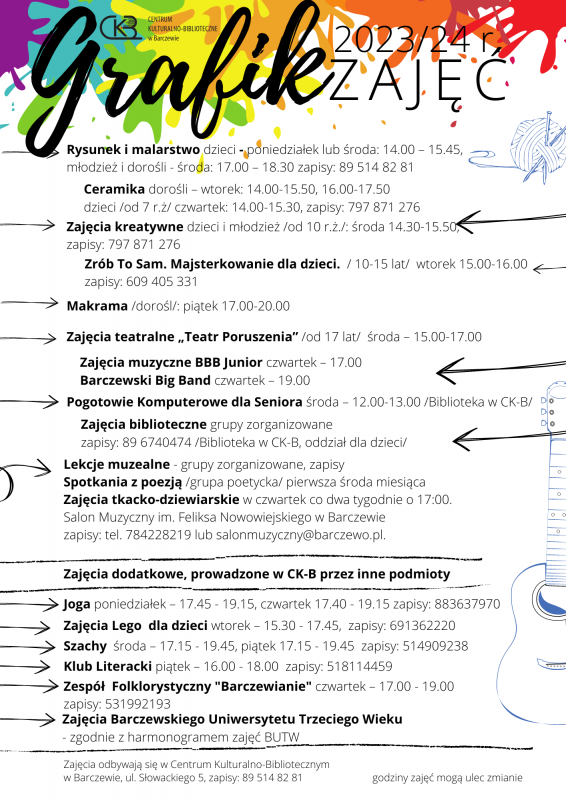 AdminCKB kultura i sztuka | ZAJĘCIA, WARSZTATY 18 sierpnia 2023 18 sierpnia 2023 Zapraszamy na zajęcia organizowane w Centrum Kulturalno-Bibliotecznym. Grafik-10Pobierz