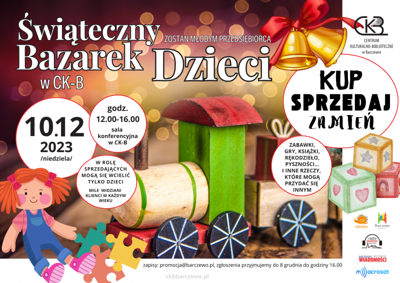 Wzywamy młodych przedsiębiorców: wierzymy w pielęgnowanie kreatywności i zachęcanie młodych umysłów do odkrywania swojego potencjału w zakresie przedsiębiorczości. Jeśli Twoje dziecko ma pasję do rękodzieła, pieczenia, interesuje je handel swoimi zbiorami lub ma inny talent, którym chciałby się podzielić, zapraszamy je do wzięcia udziału i zostania sprzedawcą na naszym Świątecznym Bazarku Dzieci. Niezależnie od tego, czy są to zabawki, z których wyrośli, ręcznie robione ozdoby, pyszne smakołyki, czy świąteczne kreacje, zapraszamy ich do założenia własnego stoiska i wzięcia udziału w tym magicznym wydarzeniu.