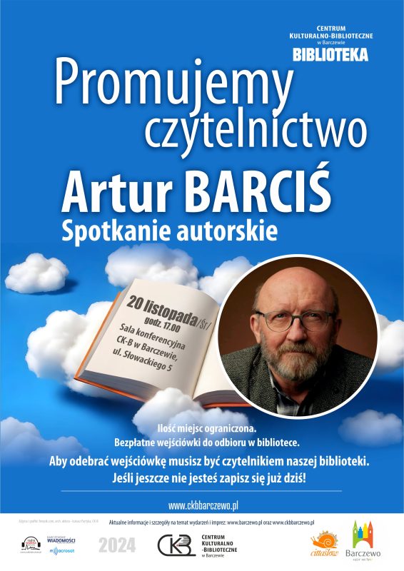 Artur Barciś – aktor teatralny, filmowy, telewizyjny i dubbingowy, reżyser, lektor oraz ambasador kampanii „Cała Polska czyta dzieciom” już wkrótce w Barczewie! Zapraszamy do Centrum Kulturalno-Bibliotecznego w Barczewie na spotkanie z cyklu „Promujemy czytelnictwo”. Środa 20 listopada 2024 r., godz. 17.00, sala konferencyjna CK-B, ul. Słowackiego 5. Ilość miejsc ograniczona! Bezpłatne wejściówki do odbioru w bibliotece. Aby je odebrać musisz być czytelnikiem naszej biblioteki. Nie jesteś – zapisz się już dziś! Zapraszamy!