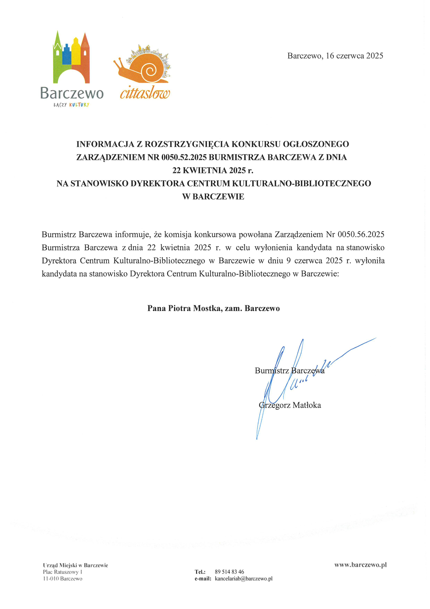 Burmistrz Barczewa informuje, że komisja konkursowa powołana Zarządzeniem Nr 0050.56.2025 Burmistrza Barczewa z dnia 22 kwietnia 2025 r. w celu wyłonienia kandydata na stanowisko Dyrektora Centrum Kulturalno-Bibliotecznego w Barczewie w dniu 9 czerwca 2025 r. wyłoniła kandydata na stanowisko Dyrektora Centrum Kulturalno-Bibliotecznego w Barczewie: