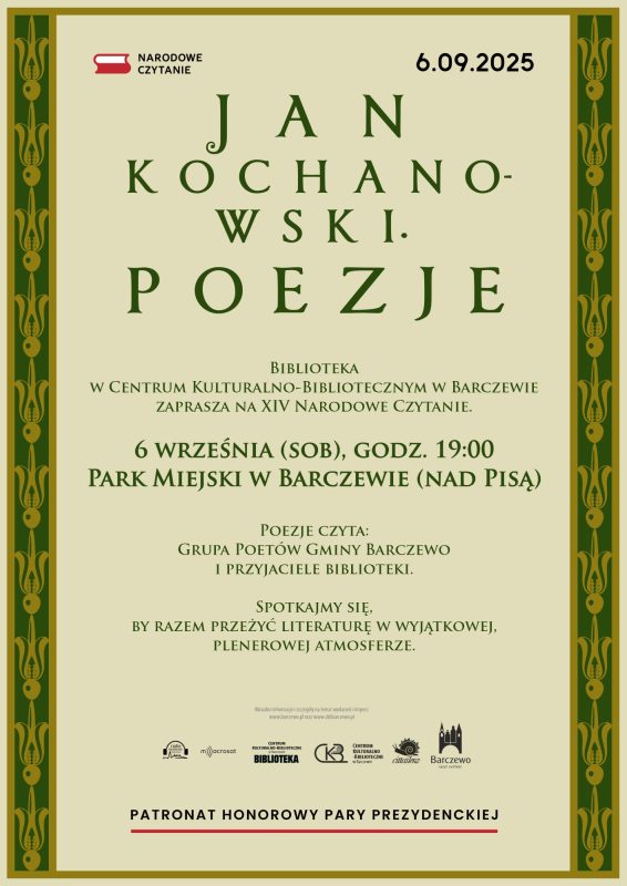 bibliotekaLS BIBLIOTEKA | WYDARZENIA 29 sierpnia 2025 29 sierpnia 2025 Zapraszamy na Narodowe Czytanie poezji Jana Kochanowskiego!