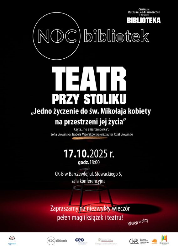 Zapraszamy na Noc Bibliotek z Teatrem przy Stoliku! W ramach ogólnopolskiej akcji Noc Bibliotek już 17.10.2025 r. w naszej bibliotece odbędzie się wyjątkowe spotkanie z Teatrem przy Stoliku. Usłyszymy tekst autorstwa Józefa Głowińskiego, poświęcony marzeniom kobiety na różnych etapach jej życia. W interpretacji wystąpią członkowie amatorskiej grupy teatralnej „Trio z Watemborka”: Zofia Głowińska, Izabela Mizerakowska, Józef Głowiński – autor. To doskonała okazja, by wspólnie przeżyć literaturę w kameralnej, teatralnej formie i docenić twórczość naszych lokalnych artystów. Serdecznie zapraszamy!