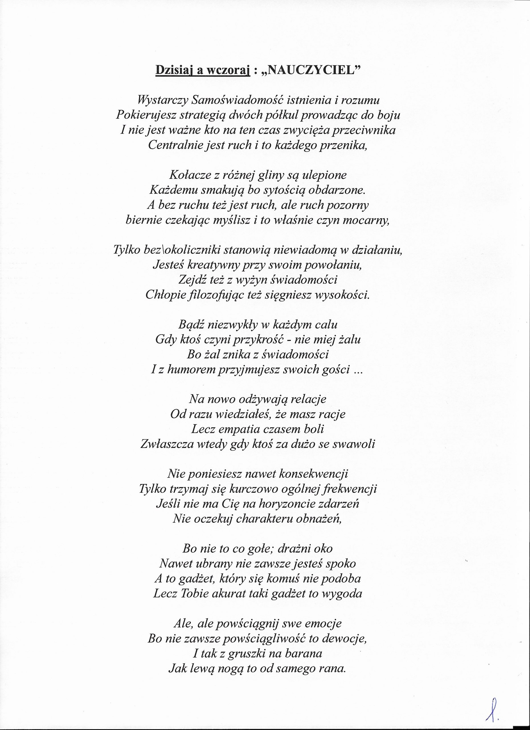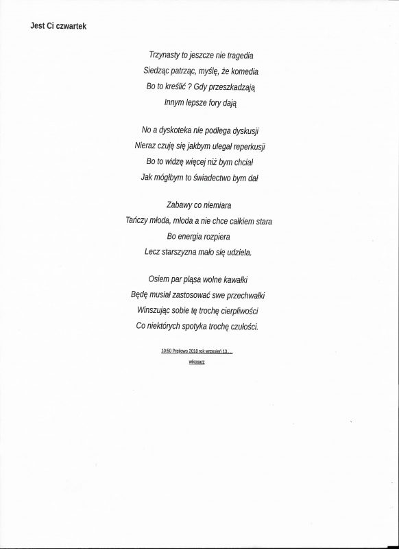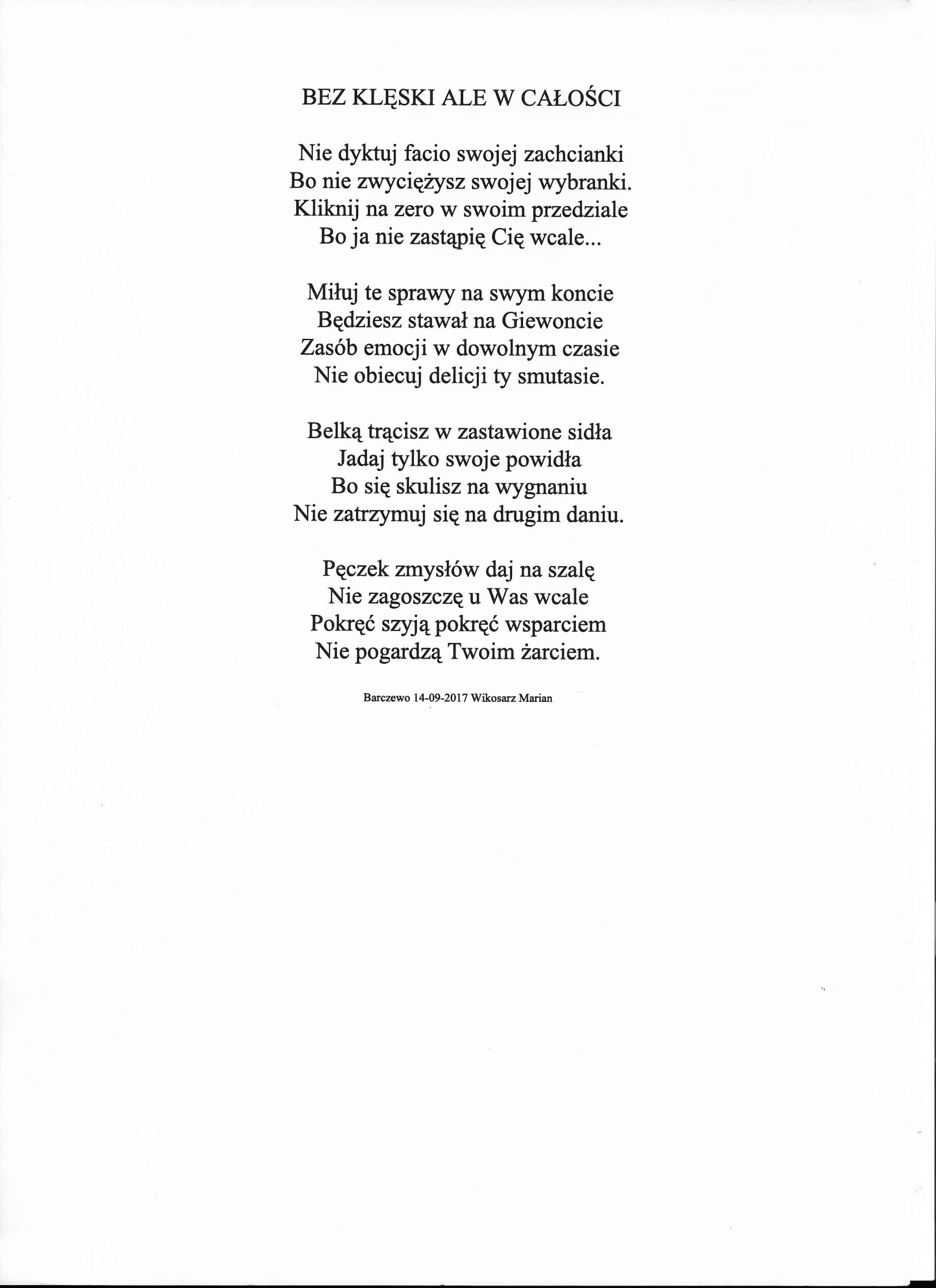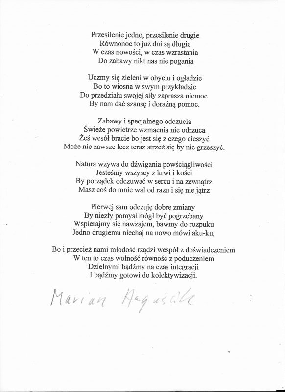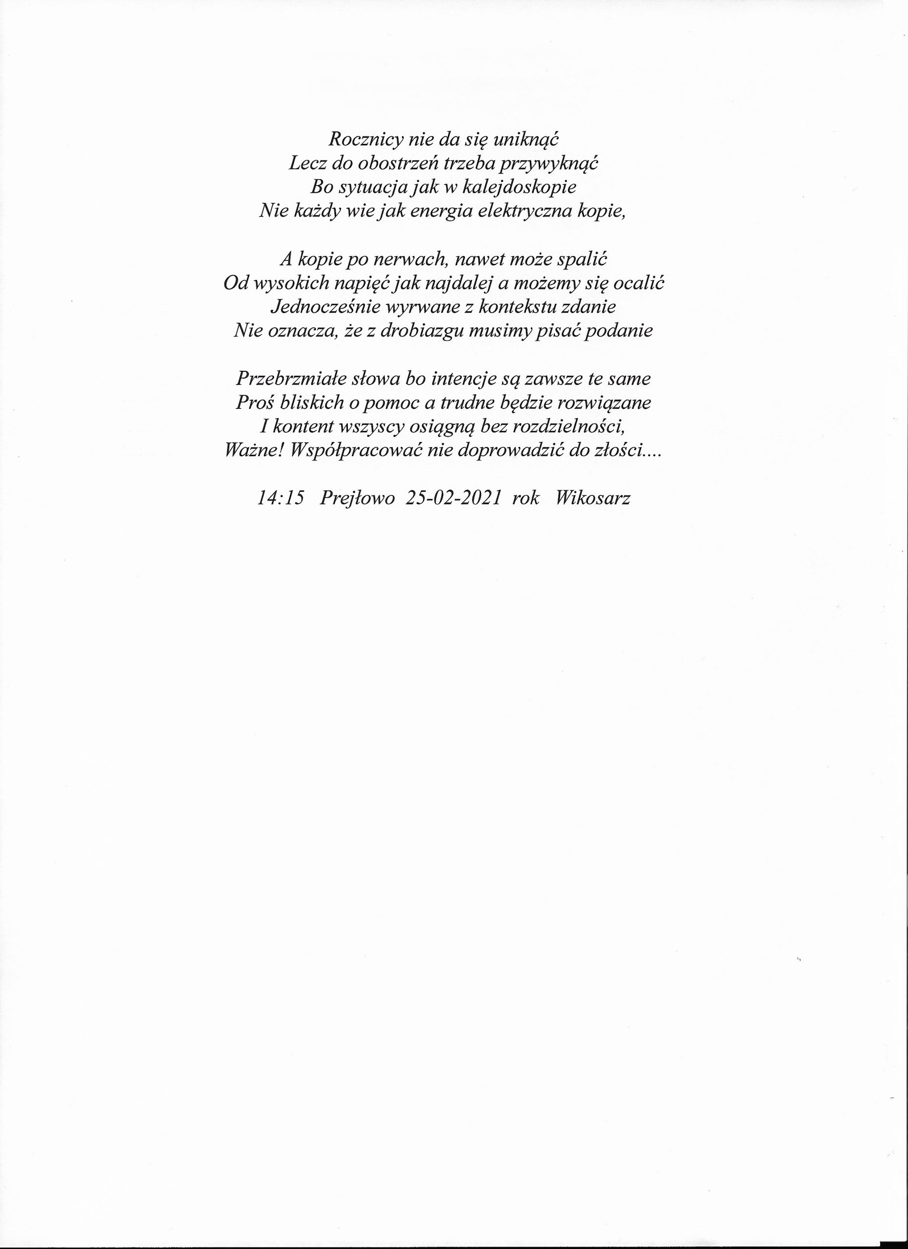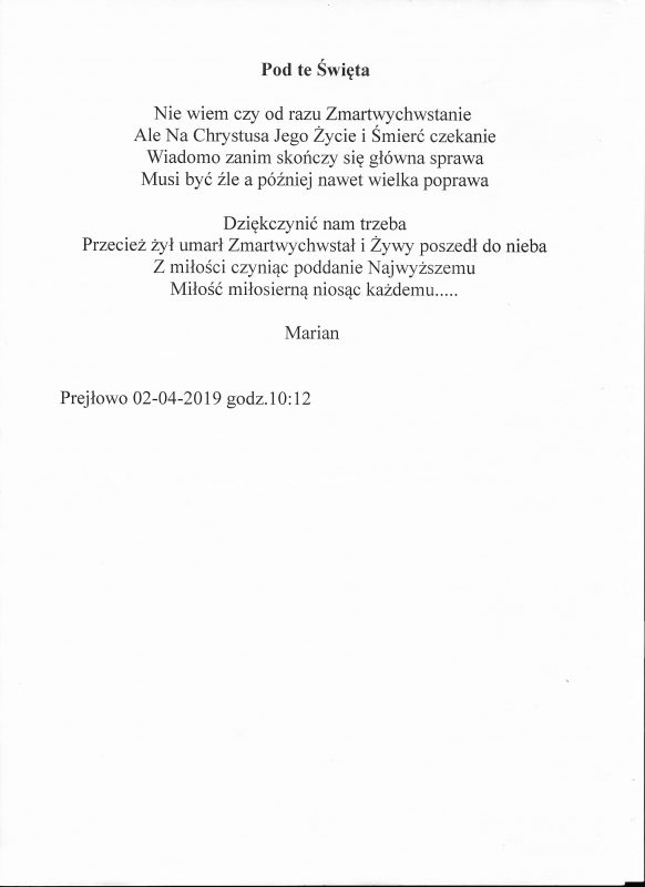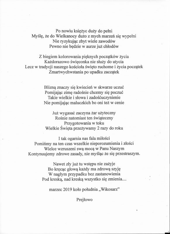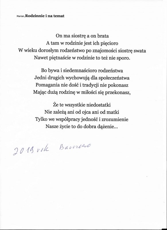 Jestem już człowiekiem wiekowym, lecz młodym duchowo. Moja twórczość zaczynała się już w wieku nastoletnim. Wtedy próbowałem przelać swoje emocje na kartkę. Teraz, w wieku dojrzałym kontynuuję rozwijanie swoich zainteresowań. Jestem uczestnikiem Środowiskowego Domu Samopomocy w Marcinkowie z filią w Prejłowie. Dzięki wsparciu i zainteresowaniu moją osobą mogę doskonalić swoje umiejętności pisarskie. Piszę wiersze o różnej tematyce, występuję publicznie prezentując swój talent, nie tylko poetycki. Lubię również wyzwania sceniczne. Moje utwory nawiązują do różnych okazji: świąt, wydarzeń, a także do osobistych przeżyć i przemyśleń. Chciałbym podzielić się swoją twórczością ze społecznością lokalną oraz wziąć udział w szkoleniach, zajęciach tematycznych organizowanych w naszej gminie.
