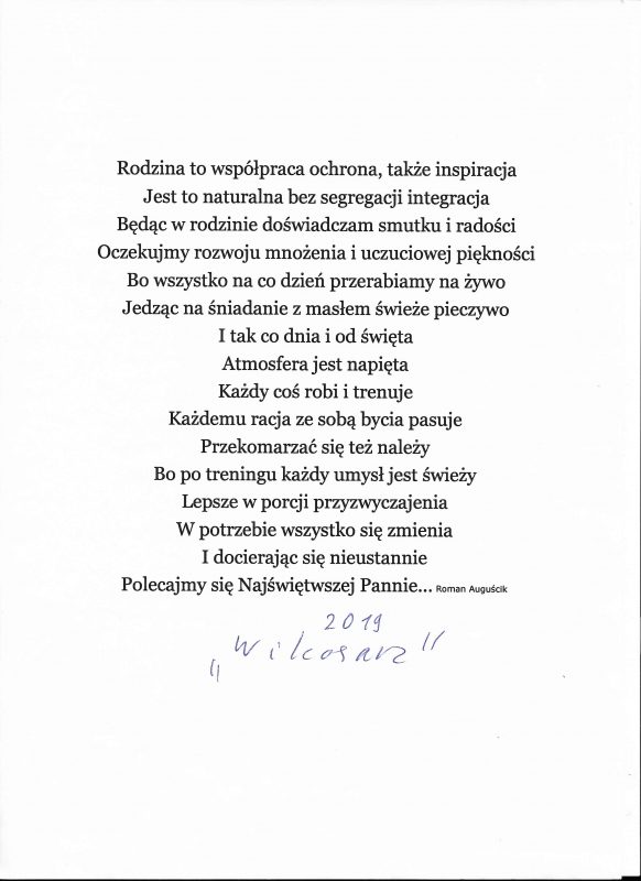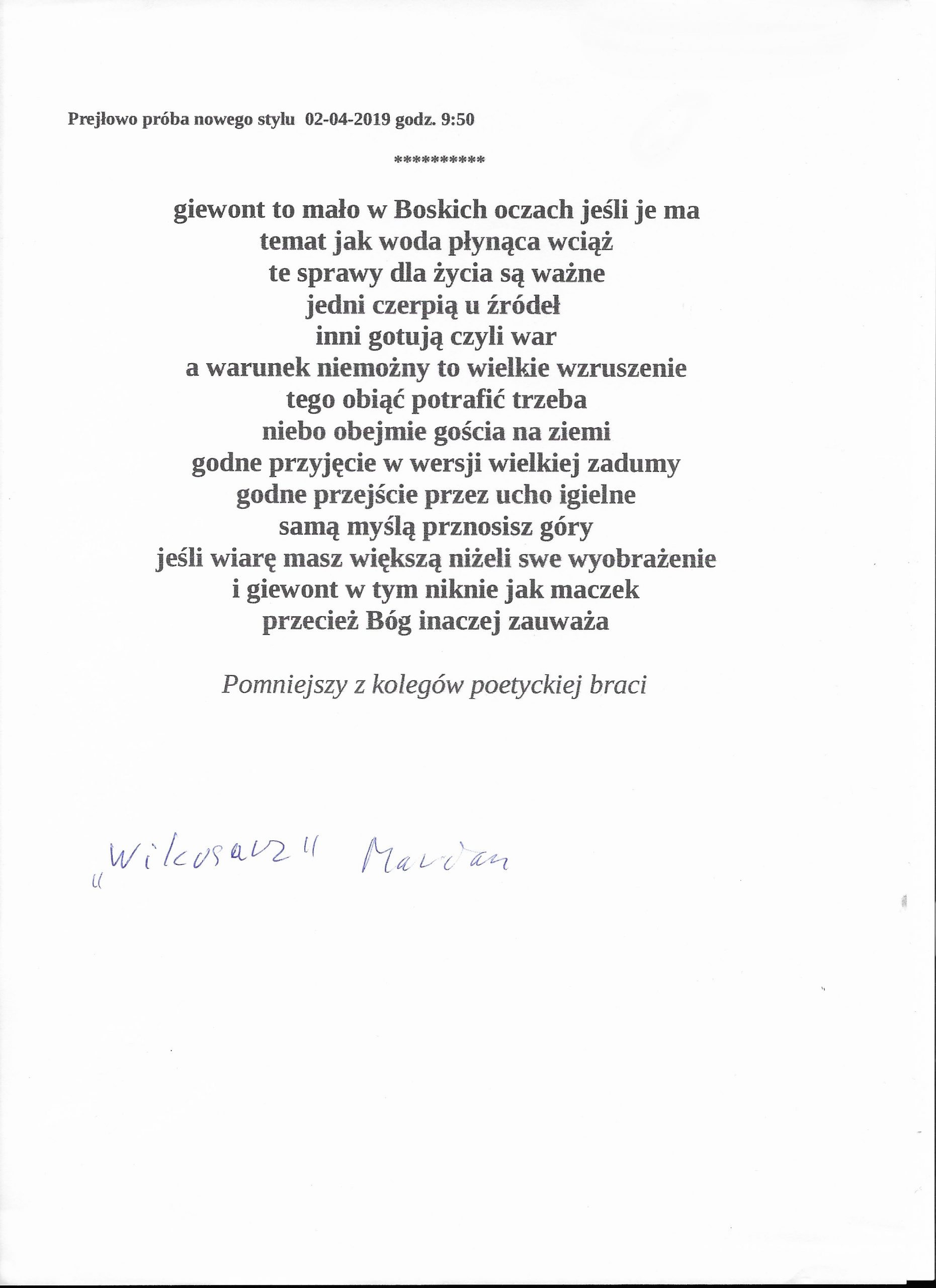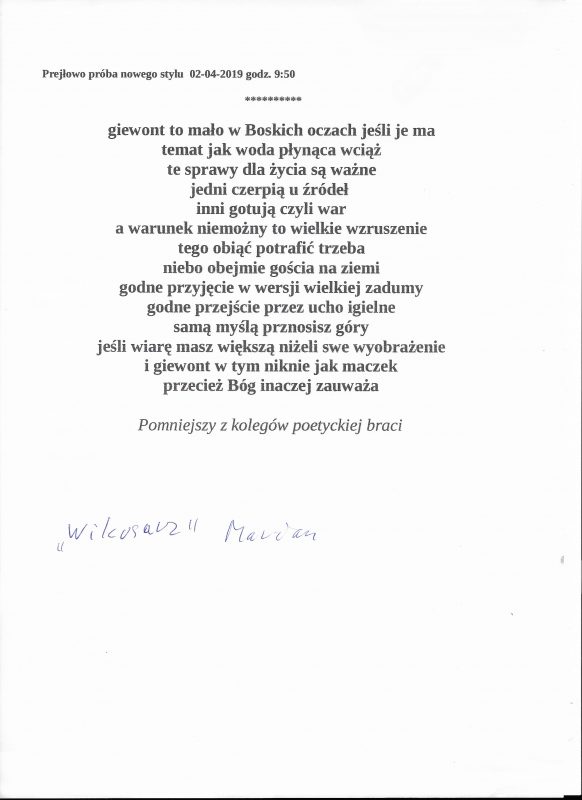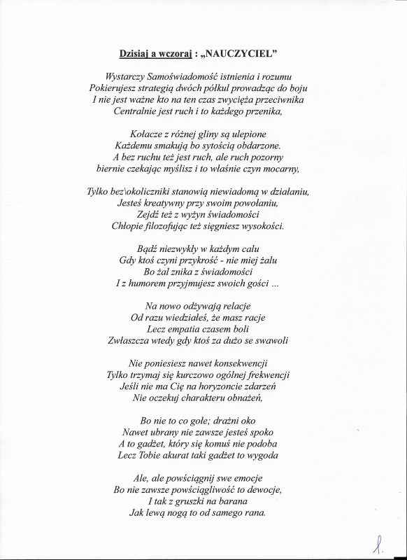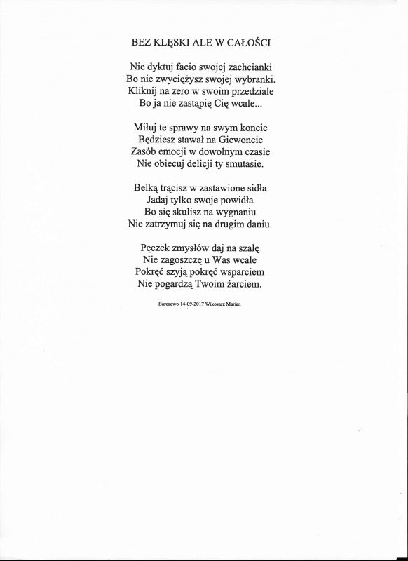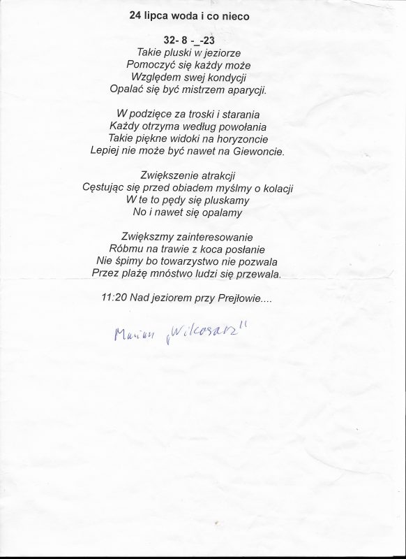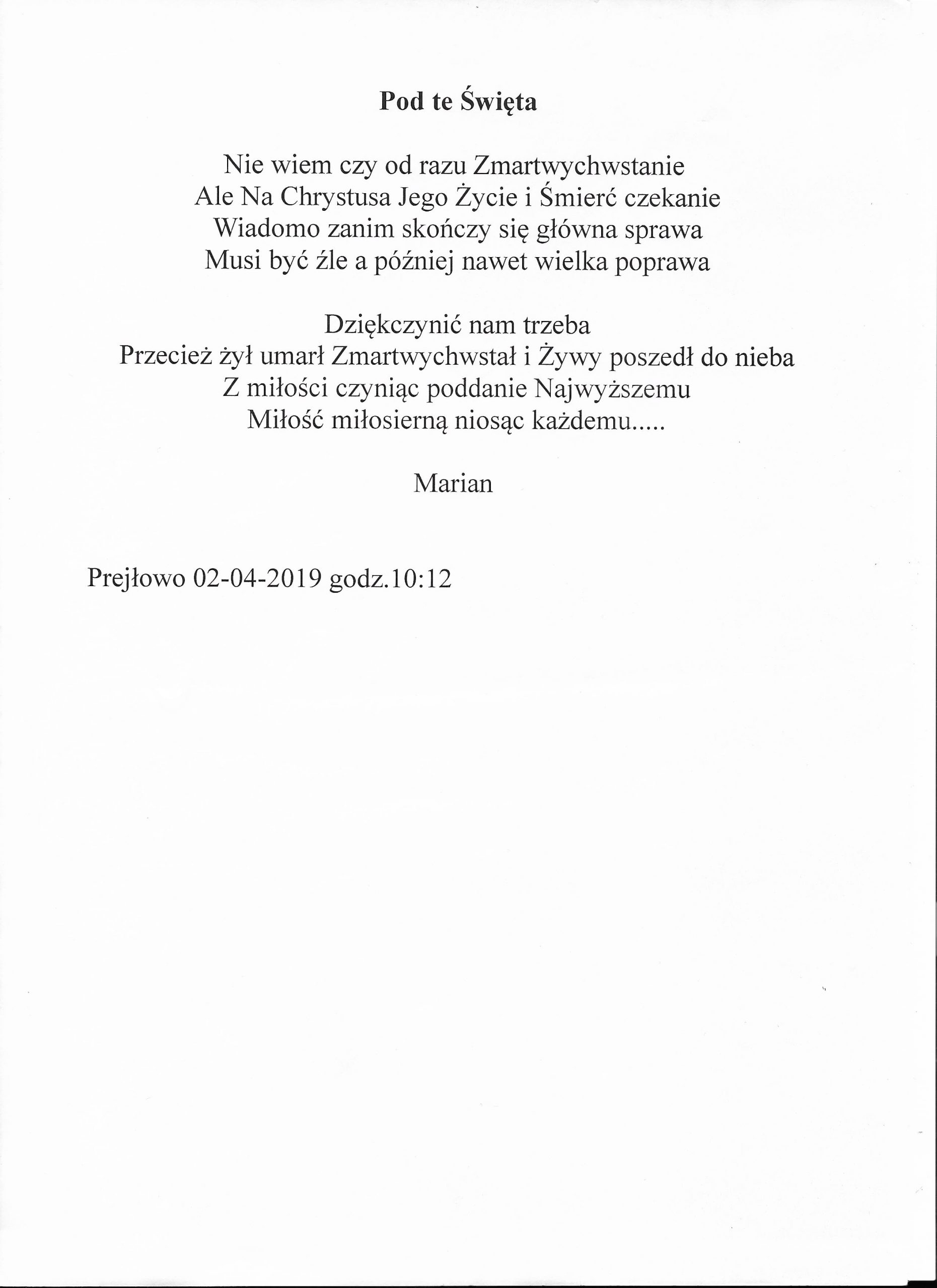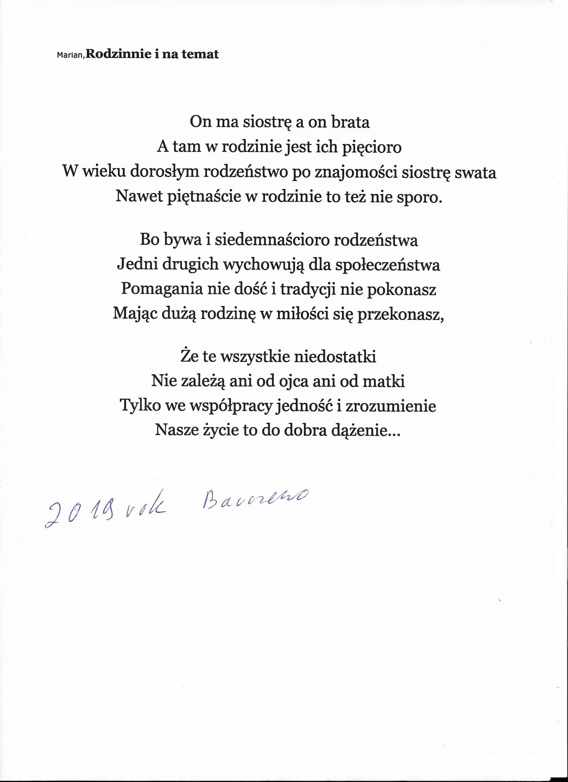 Jestem już człowiekiem wiekowym, lecz młodym duchowo. Moja twórczość zaczynała się już w wieku nastoletnim. Wtedy próbowałem przelać swoje emocje na kartkę. Teraz, w wieku dojrzałym kontynuuję rozwijanie swoich zainteresowań. Jestem uczestnikiem Środowiskowego Domu Samopomocy w Marcinkowie z filią w Prejłowie. Dzięki wsparciu i zainteresowaniu moją osobą mogę doskonalić swoje umiejętności pisarskie. Piszę wiersze o różnej tematyce, występuję publicznie prezentując swój talent, nie tylko poetycki. Lubię również wyzwania sceniczne. Moje utwory nawiązują do różnych okazji: świąt, wydarzeń, a także do osobistych przeżyć i przemyśleń. Chciałbym podzielić się swoją twórczością ze społecznością lokalną oraz wziąć udział w szkoleniach, zajęciach tematycznych organizowanych w naszej gminie.